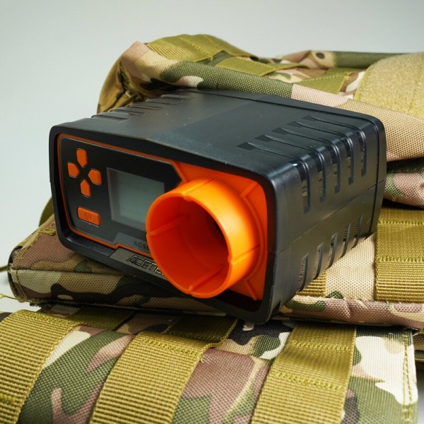 The monochrome backlit LCD display with 128*64 resolution displays muzzle velocity, cadence, energy, ammunition parameters and serial number. The meter has an automatic shutdown function after inactivity and low battery voltage, as well as a history of the last 25 measurements (memory is erased after shutdown).