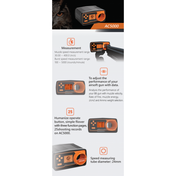 • Measuring range: 30 - 400 m/s (90 to 1200 FPS).
