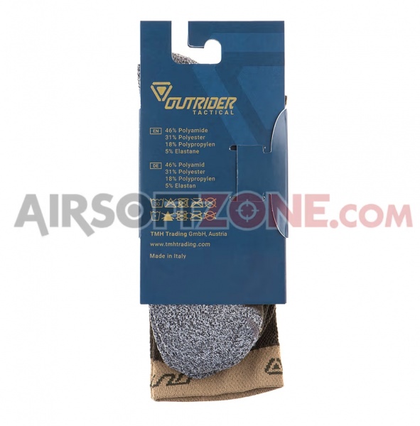 Șosetele din seria Tactical Performance a Outrider sunt caracterizate de confortul și potrivirea lor buna. Construcția zonală a fost poziționată conform cerințelor de confort din EDC (Carry Zilnic), la poligon și în aplicatii pentru forțele de ordine. Compoziția materialului din 47% poliamidă, 26% poliester, 23% polipropilenă și 4% elastan oferă durabilitate extinsă și transfer rapid al transpirației, menținând piciorul cât mai uscat posibil.