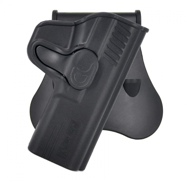 - Are un buton lock, care poate fi ușor apăsat cu degetul index pentru scoaterea rapidă a pistolului